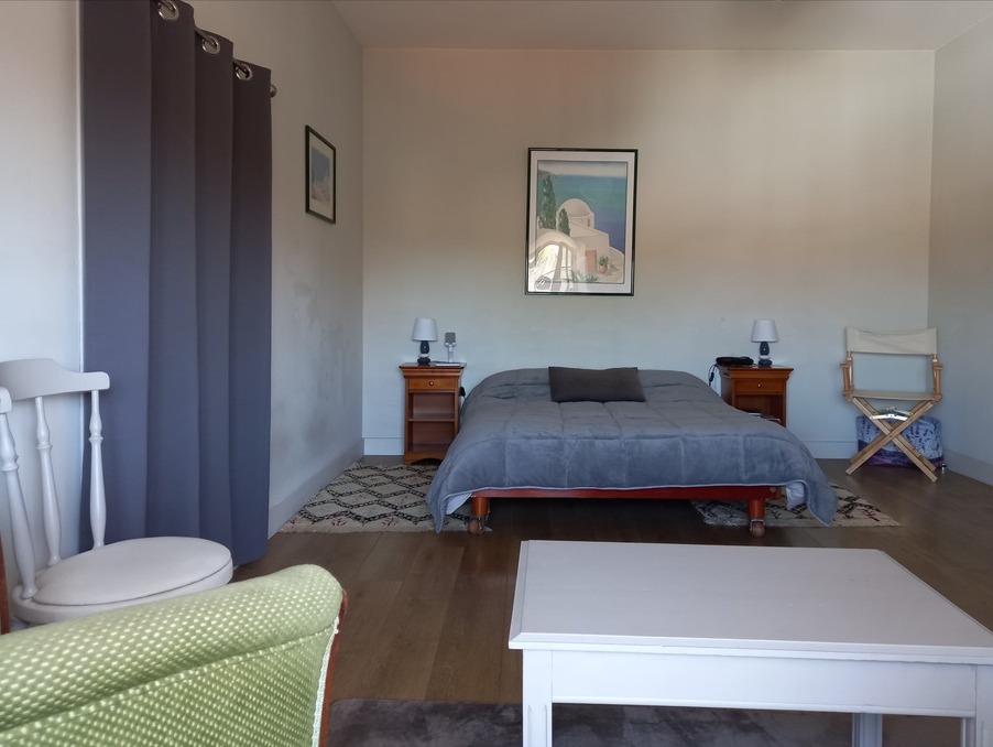 Une chambre avec un lit en 140 cm avec vue sur le séjour.