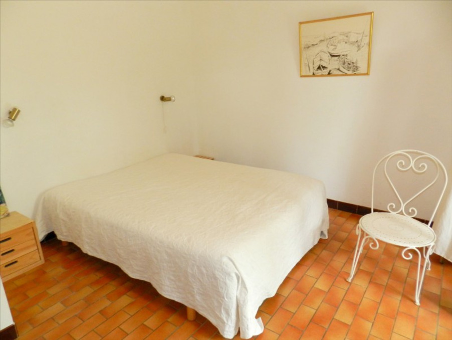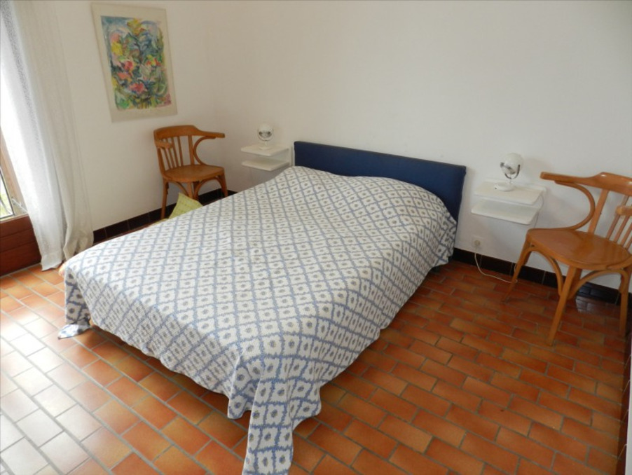 Une chambre de 16 m2 env. avec un lit de 200 par 200, une penderie, des étagères, un coin avec un lavabo et un bidet.