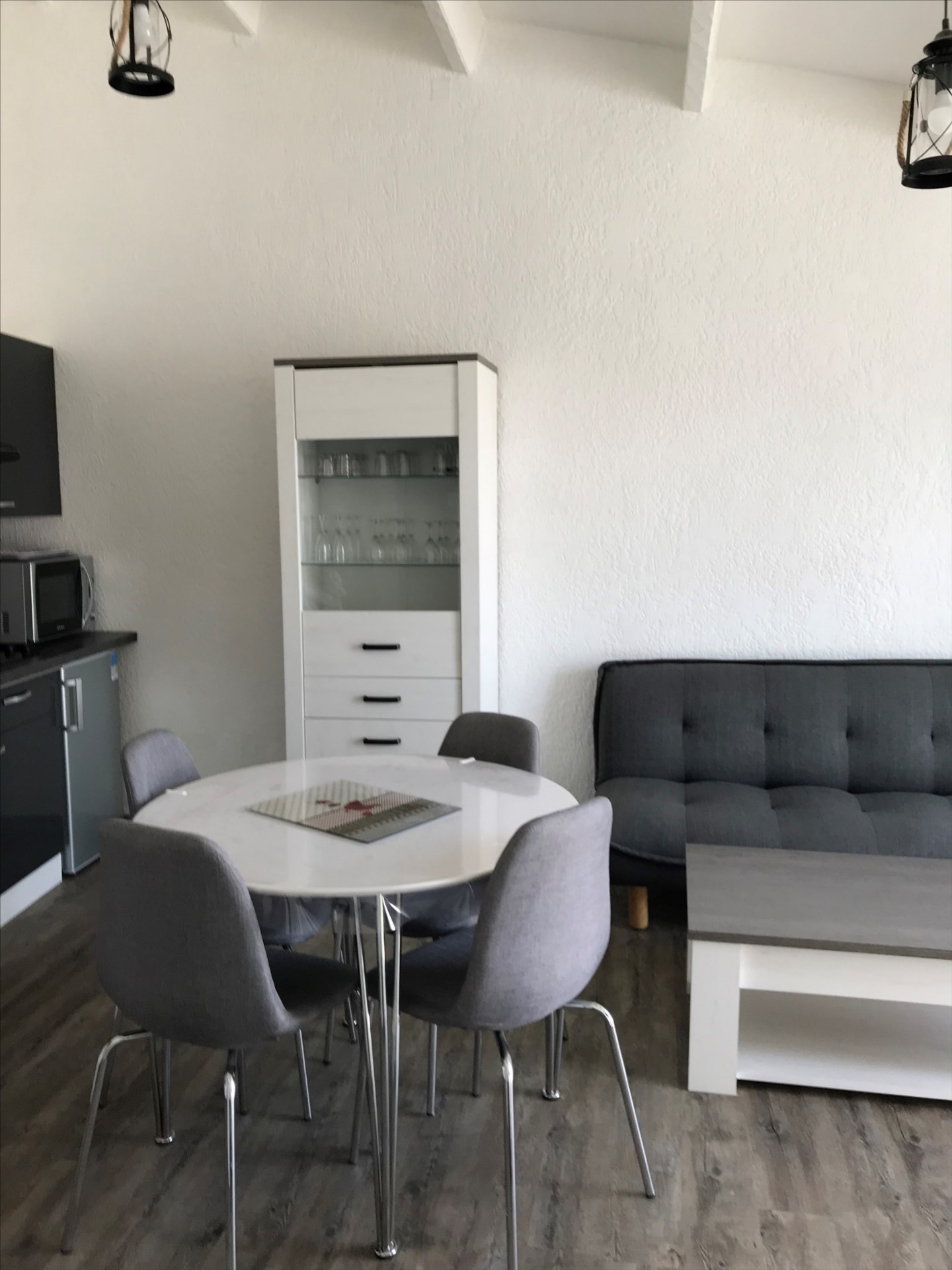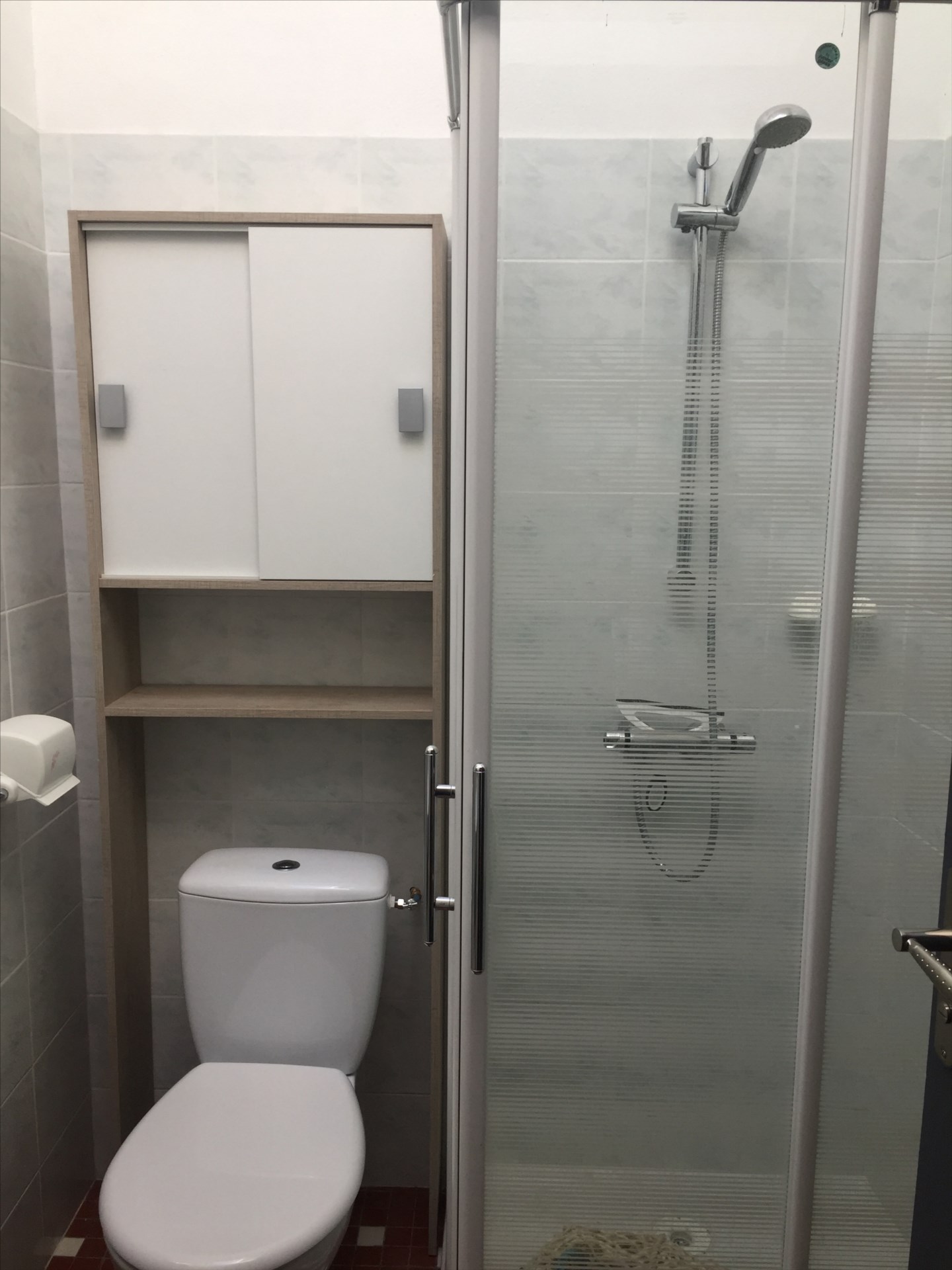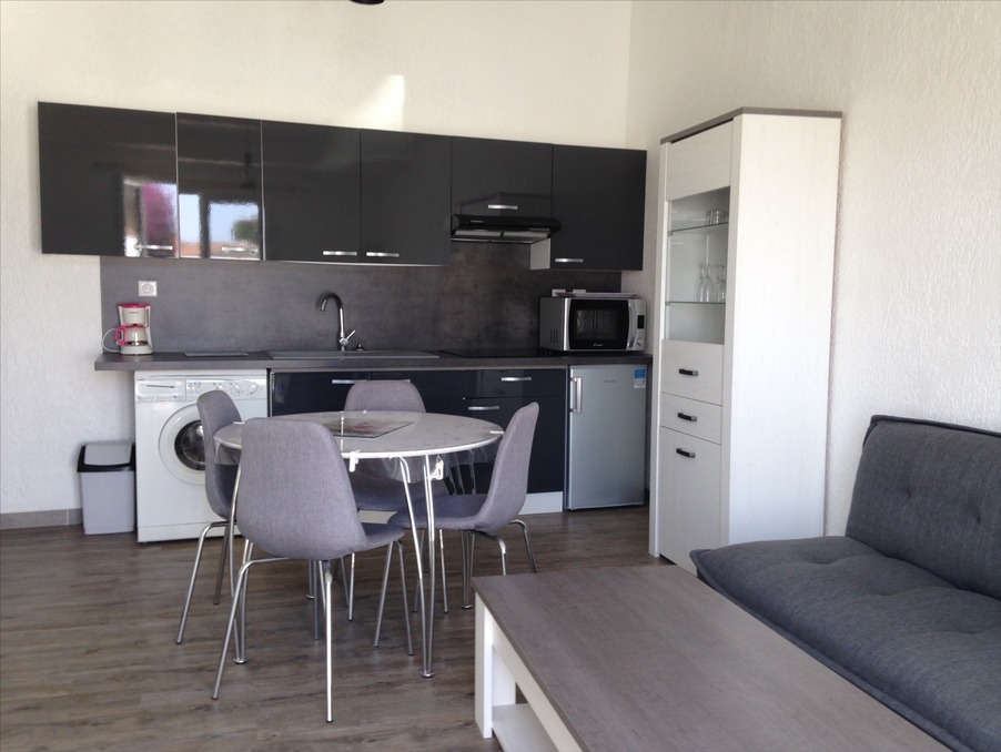 EQUIPEMENTS : Un réfrigérateur tabe top avec son compartiment freezer, un four combiné micro-ondes, plaque en vitrocéramique, lave-linge, ustensiles,