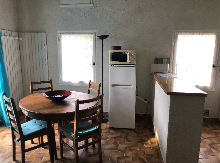 Une pièce à vivre avec cuisine américaine, coin repas et coin détente avec 2 lits en 90 cm.