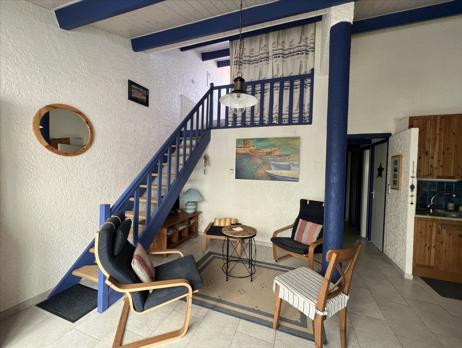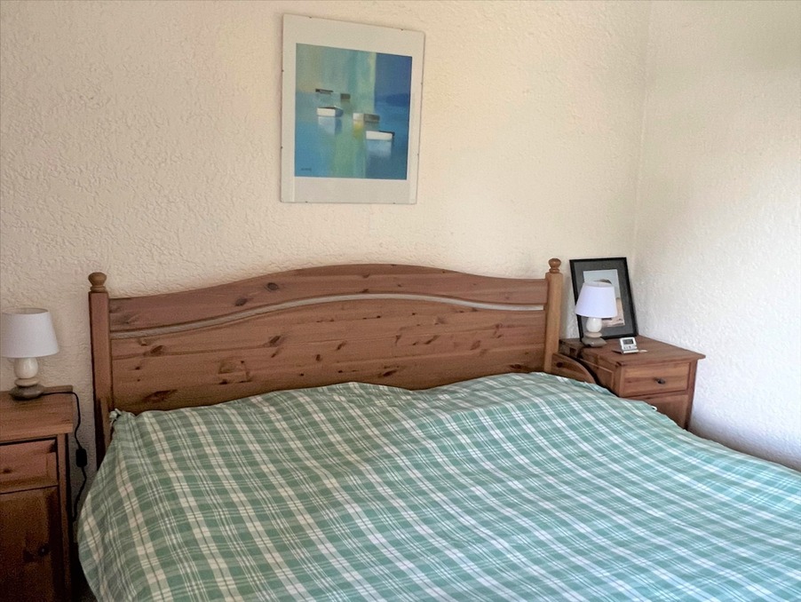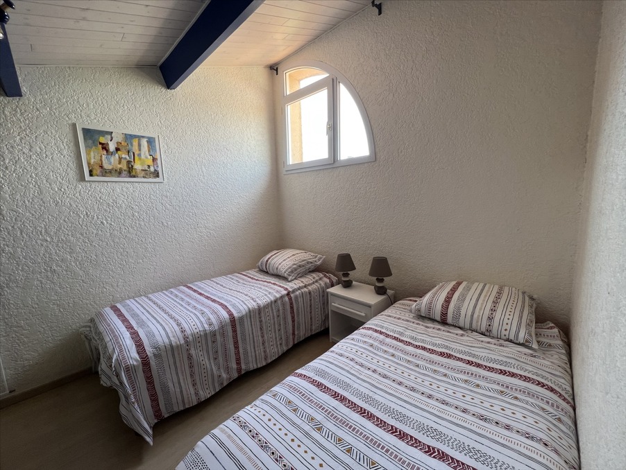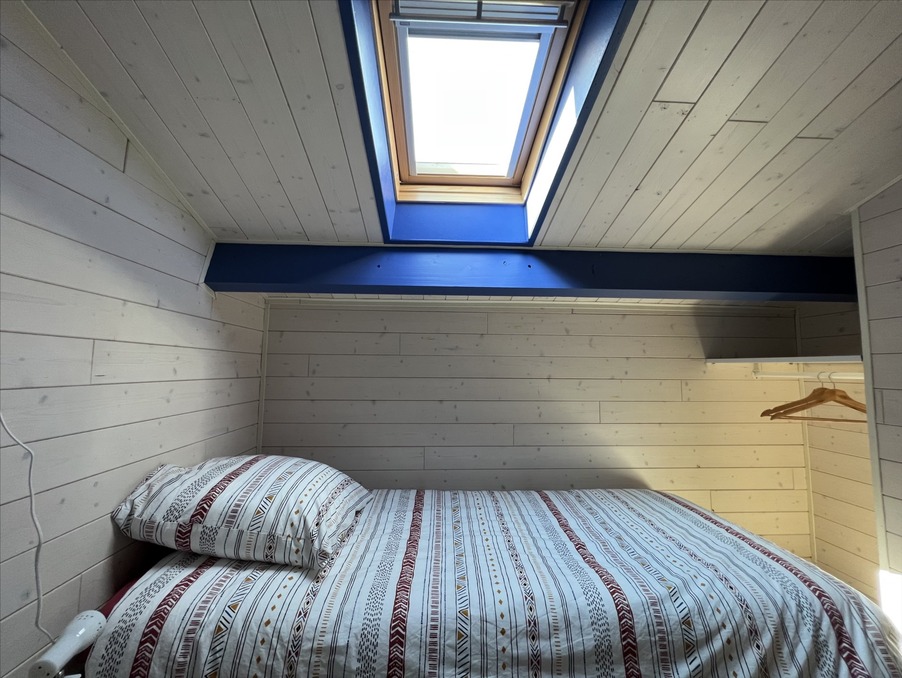 Une chambre en mézzanine deux lits en 90 cm et une chambre en enfilade avec un lit en 90 cm.