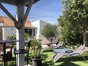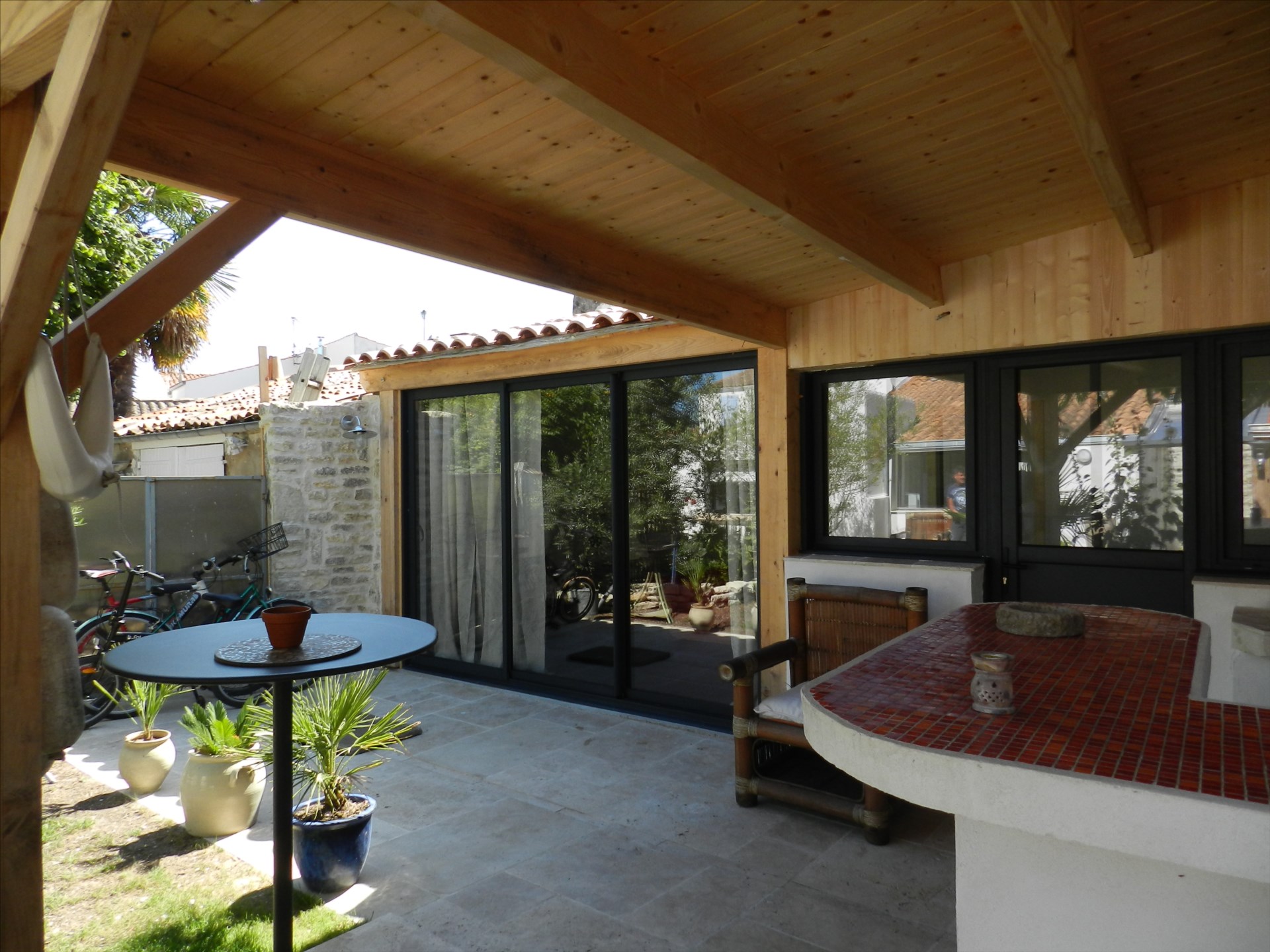 Dans le jardin clos de murs, barbecue et coin repas sous un grand auvent avec mobilier de jardin.