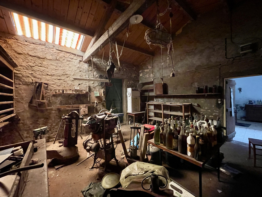Cet ensemble comprend une maison à rénover d'environ 110 m2 avec une pièce de vie avec cheminée, trois chambres, une salle d'eau, un atelier avec un wc, deux pièces à aménager et une véranda. Un grand grenier à rehabiliter. Attenant à la maison, un chai en pierre.