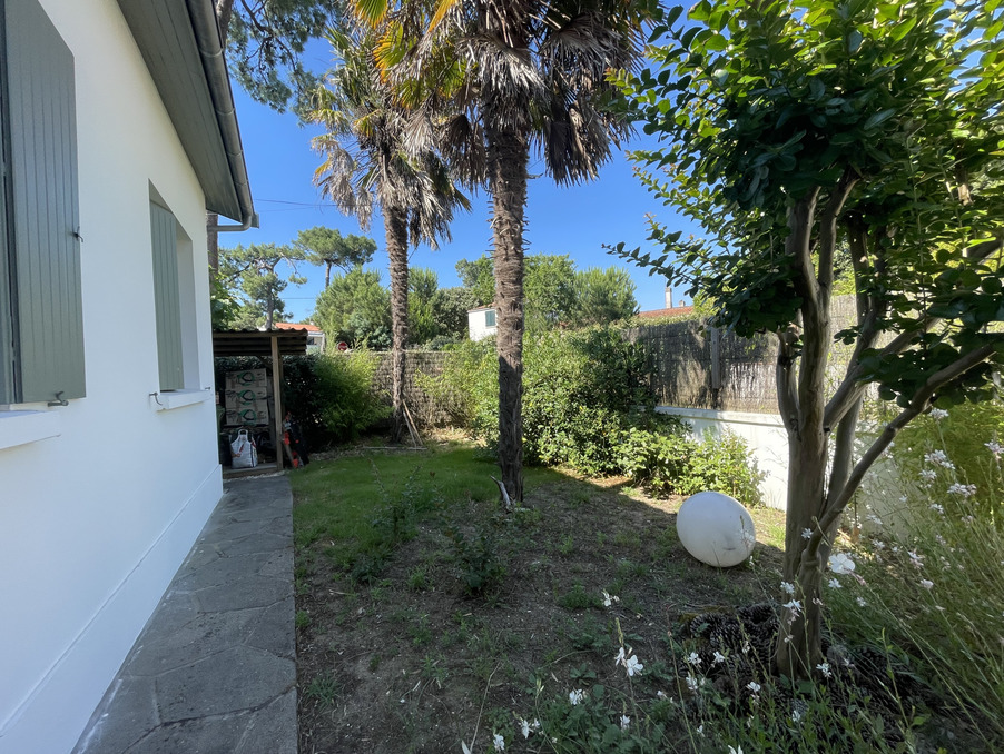 Jardin de env 460 m2 arboré de pins avec terrasse bois .